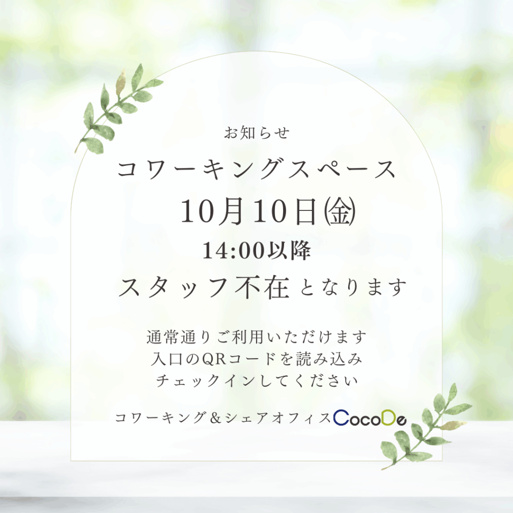 いつもコワーキング&シェアオフィスCocoDeをご利用いただきありがとうございます。 2025年10月10日(金)14:00以降はスタッフが不在となります。 ※通常通りご利用いただけます。 初めてご利用の方 ①下記サイトより「いいアプリ」をダウンロードの上、会員登...