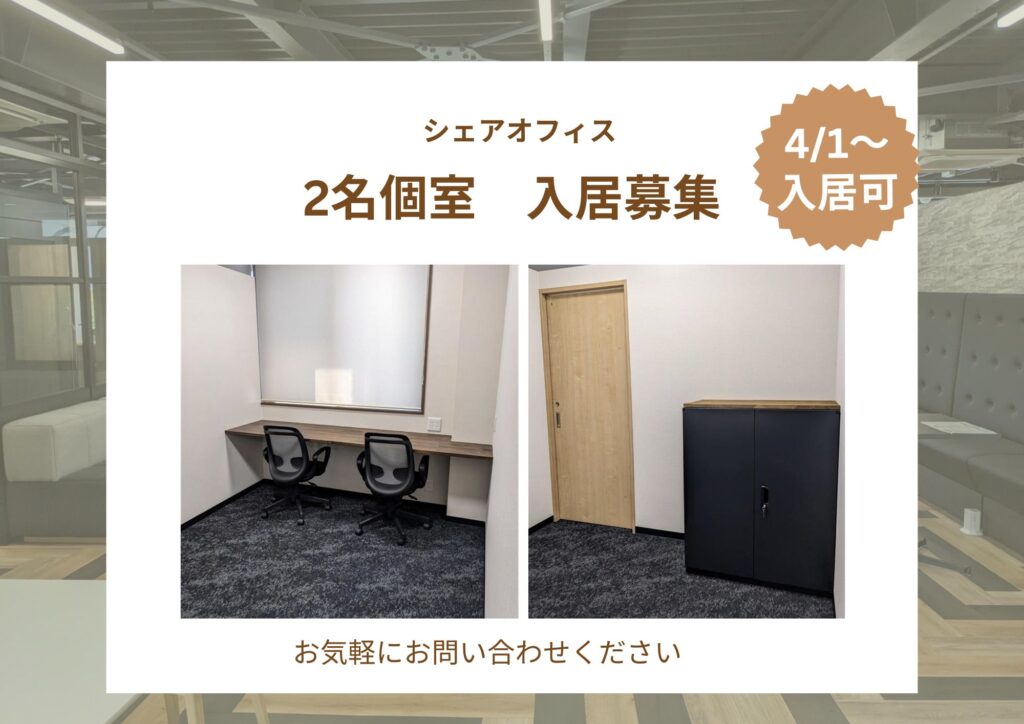 人気の2名様用個室が、4月より空き予定となりました。 月額利用料 52,800円入会金 33,000円・鍵付き専用個室・オフィス家具付き(机、椅子2脚、鍵付き書庫)・インターネット水道光熱費込み・駐車場1台付き(2台目以降有料)・24時間365日利用可・法人登... -