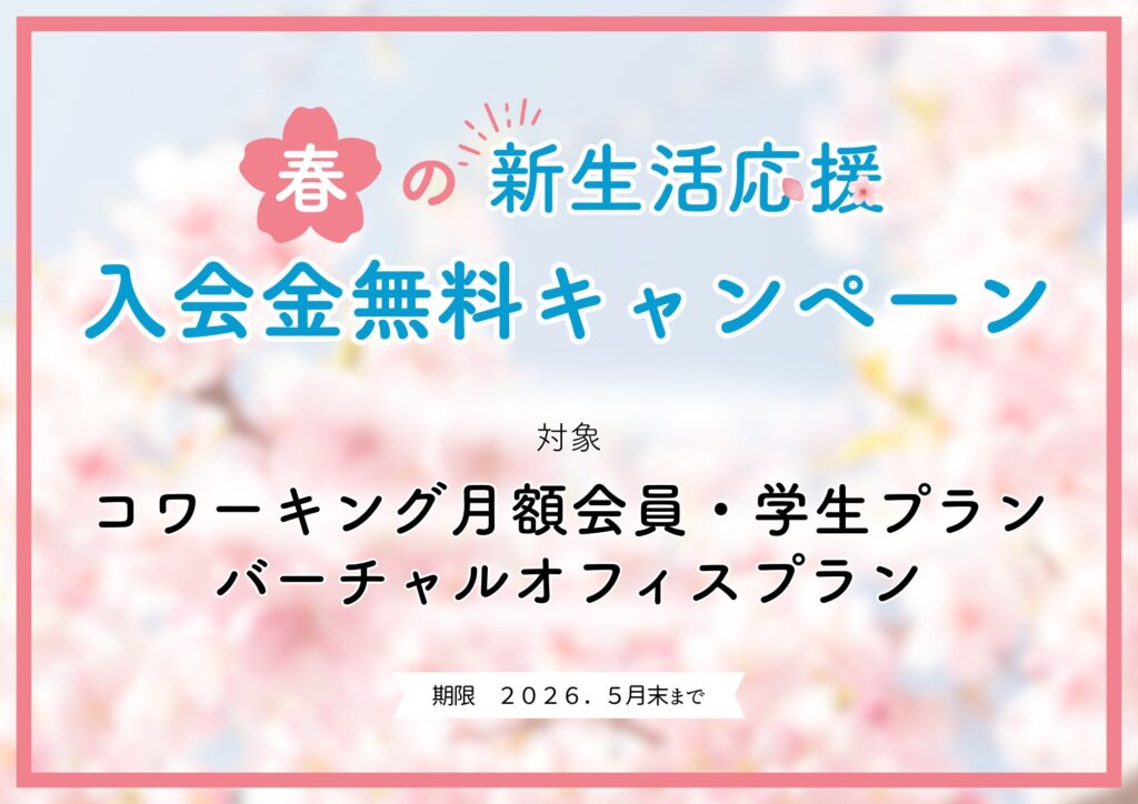 この度CocoDeでは春の新生活応援キャンペーンとして入会金無料キャンペーンを実施します! 〚対象プラン〛・コワーキング月額会員 入会金11,000円 → 0円・バーチャルオフィスプラン 入会金11,000円 → 0円・学生プラン 入会金 5,5... -